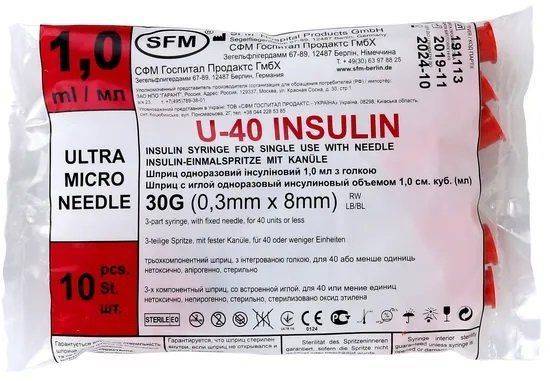 SFM Insulin Syringe with Needle, 1ml U-40, 30G (0.3mm x 8mm), 10 Pack