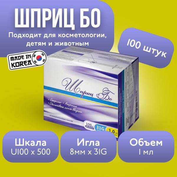 BO Insulin Syringes: 1ml U-100, 31G (0.26 x 8mm), 100 Count - Sterile, for Botox & More