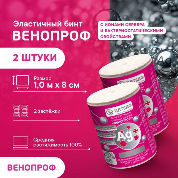 This 2-pack of Inteks Venoprof compression bandages offers superior wound care and support. Each bandage measures 1m x 8cm and features medium elasticity with secure metal clasps. Unlike standard elastic bandages, Venoprof incorporates silver ions into specially modified polypropylene threads. This provides significant bacteriostatic action, making them ideal for use with skin conditions. Silver ions promote skin healing, reduce allergic reactions, and aid in the treatment of minor skin injuries and trophic ulcers.