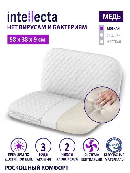 Experience unparalleled comfort and support with the Intellecta Orthopedic Pillow. Crafted from next-generation Memory Foam infused with eco-friendly CopperGel, this pillow provides a luxurious sleep experience for adults and teens alike. Developed by a team of Russian and European experts, this revolutionary high-density material combines the softness of down with the supportive properties of memory foam. Our patented CopperGel technology boasts antimicrobial and antibacterial properties, reducing virus and bacteria activity faster than standard pillows. Certified CertiPUR for environmental safety, this versatile pillow is ideal for back, stomach, and side sleepers. Featuring two removable, washable covers with zippers and compatible with 50x70cm pillowcases, it's designed for lasting comfort. Enjoy a 3-year extended warranty and explore our range of sizes at Intellecta. Sleep soundly and wake up healthier!