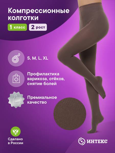 Keywords: compression stockings, varicose veins, Intex, class 1 compression, 18-21 mmHg, medical stockings, support stockings, brown stockings, leg pain relief, swelling reduction, vein health, thrombosis prevention, comfortable stockings, durable stockings, affordable stockings, made in Russia, size chart.