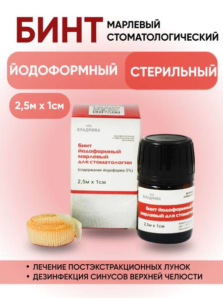 Keywords: iodoform gauze bandage, sterile bandage, post-extraction socket, maxillary sinus disinfection, wound care, antiseptic bandage, bactericidal, absorbent bandage, dental bandage, surgical bandage, 100% cotton bandage, iodoform, free iodine, 2.5m x 10mm bandage.