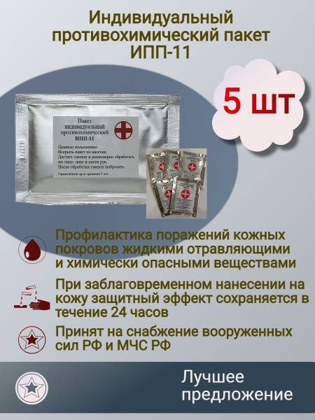 Keywords: IPP-11, individual anti-chemical packet, first aid, tactical kit, emergency preparedness, chemical protection, burn treatment, wound care, antiseptic, decontamination, military supplies, outdoor gear, survival gear, first responder equipment, personal safety, chemical warfare, biological warfare, metallized pouch, neutralizing solution, 5-pack.