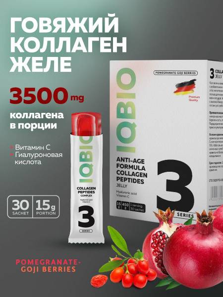 Keywords: Beef collagen, collagen jelly, pomegranate, goji berries, vitamin C, hyaluronic acid, collagen supplements, skin health, hair health, nail health, joint health, immune support, beauty supplement, health supplement, IQBIO, 30 sachets, ready-to-drink, all-natural, no GMO, gluten-free, soy-free, collagen for skin, collagen for hair, collagen for nails, collagen for joints.