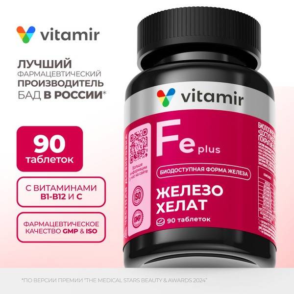 Vitamir Pro is a dietary supplement designed to prevent anemia and maintain healthy hemoglobin levels in women. It features highly bioavailable chelated iron (iron bisglycinate) combined with a comprehensive B vitamin complex for optimal absorption and effectiveness. Vitamins B1, B2, B6, B9 (folic acid), and C support iron absorption, boost metabolism, and provide antioxidant protection. Take one tablet daily with a meal for a month. GMP and ISO certified for quality and safety. Vitamir Pro supports women's health by promoting healthy hemoglobin levels, preventing anemia, and improving overall well-being.