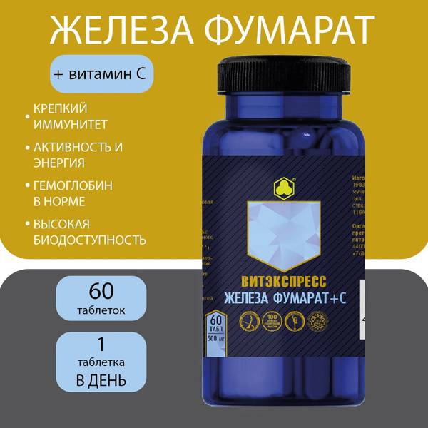 VitaExpress Ferrous Fumarate with Vitamin C from Parapharm is a concentrated vitamin and mineral supplement designed to combat iron and Vitamin C deficiencies. It helps increase hemoglobin levels and strengthen blood vessel walls. Expected health benefits include: replenishing iron and Vitamin C; stimulating red blood cell production and raising hemoglobin levels; increasing oxygen saturation and reducing oxygen consumption; improving central and peripheral hemodynamics and microcirculation; preventing and treating iron-deficiency anemia; boosting resistance to pathogens; and reducing oxidative stress. This dietary supplement provides a crucial additional source of iron and ascorbic acid, supporting: normalization of blood biochemistry; prevention of cardiovascular issues; improved vascular tone, elasticity, and strength; relief from hypovitaminosis and anemia; faster recovery from illness and surgery; enhanced antioxidant protection; and immune system modulation. Recommended dosage: Men – 1 tablet daily with food; Women and pregnant women (all trimesters) – 1 tablet twice daily with food. Start feeling energized today!
