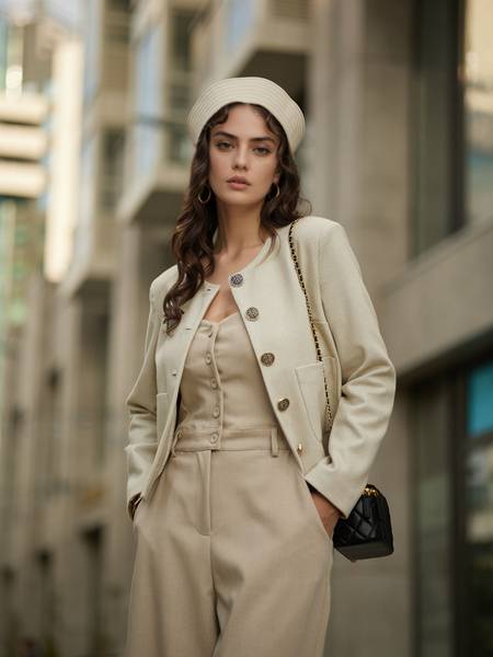 The ISSENTI women's knit tweed jacket embodies elegance and sophisticated style. Inspired by Old Money tradition, this cropped, short blazer elevates your status with impeccable taste. Its straight cut and soft lines make it a versatile wardrobe staple, perfect for everyday looks and special occasions. The soft texture provides comfortable wear in any weather. Designer details, such as the round neckline and unique buttons, add individuality and set you apart. This cropped jacket will become an indispensable part of your wardrobe, exuding confidence and creating a harmonious look.