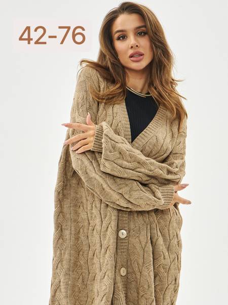 Available in an inclusive size range (42-68), this versatile piece effortlessly complements any figure – perfect for plus-size, pregnant, tall, or petite women. The elongated silhouette with a V-neckline adds elegance and sophistication to any outfit. This effortlessly stylish cardigan pairs seamlessly with any color and style, making it ideal for the office, weekend outings, or relaxing at home.