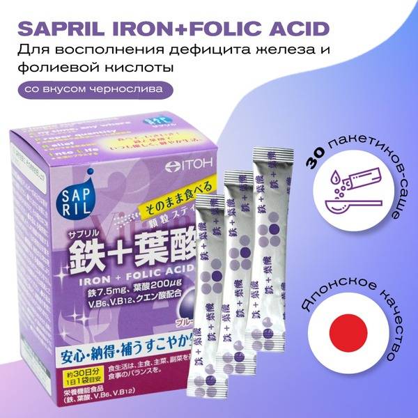 Combat iron and folic acid deficiencies with ITOH Sapril Iron + Folic Acid Sachets. These delicious plum-flavored sachets provide a convenient and effective way to replenish essential nutrients. Each serving delivers iron and folic acid, along with added vitamins B6 and B12 for enhanced absorption and overall health benefits.