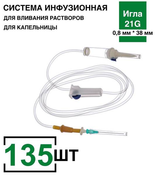 Single-use, ethylene oxide sterilized infusion set. Features a 21G x 1 ½ (0.8 x 38 mm) needle with atraumatic bevel and a Luer Slip connector. The reservoir and tubing are made from medical-grade polyvinyl chloride (PVC). The semi-rigid, transparent reservoir includes a built-in disc filter for fluid and an air vent. The 150cm tubing incorporates a latex injection port for adding medication. The integrated 35mm x 5.0mm combined plastic spike allows simultaneous fluid and air passage. The air channel features a waterproof membrane for air purification. The spike is integrated into a transparent drip chamber (6.5ml capacity) with a built-in air intake valve. The drip chamber includes a 13mm diameter, 15µm mesh disc filter. The drip rate is 20 drops/ml. The flow rate is controlled by a roller clamp. A Luer connector with 14mm wings is included. The injection port is straight, 43mm long. Packaging: 135 units per pack. Shelf life: 5 years.