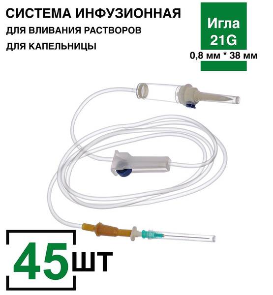 Single-use, ethylene oxide sterilized IV infusion set. Features a 21G x 1 ½ (0.8 x 38 mm) atraumatic needle with a Luer slip connection. The reservoir and tubing are made of medical-grade polyvinyl chloride (PVC). The semi-rigid, transparent reservoir incorporates a built-in disc filter for fluid and an air vent. The 150cm tubing includes a latex injection port for medication additions. The integrated, combined plastic spike (35mm length, 5.0mm diameter) allows for simultaneous fluid and air passage. The air channel features a waterproof membrane for air purification. The spike is integrated into a transparent drip chamber (6.5ml capacity) with a built-in air intake valve. The drip chamber features a 13mm diameter, 15µm mesh filter. The drip rate is 20 drops/ml. The set includes a roller clamp for flow rate adjustment and a Luer slip connector (14mm wings, transparent). A straight injection port (43mm) is also included. Packaged 45 sets per box. 5-year shelf life. Price is per box.