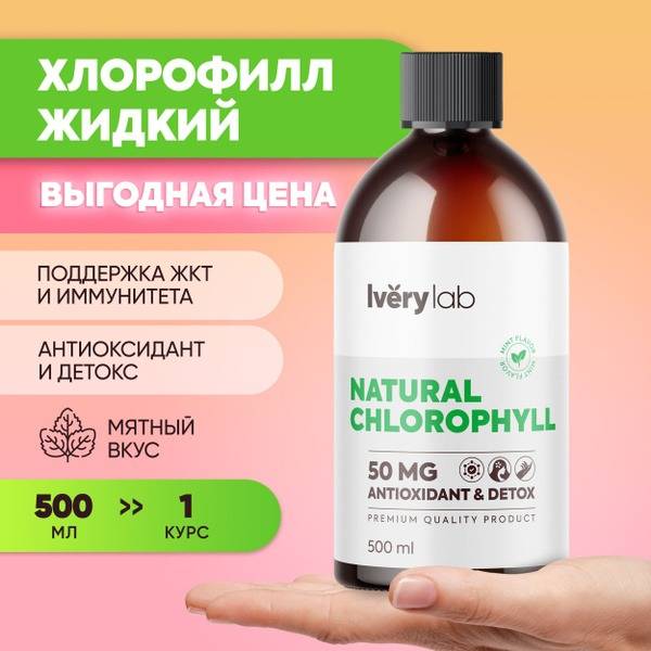 Keywords: Liquid Chlorophyll, Chlorophyll, Iverylab, Detox, Antioxidant, Immune Support, Weight Management, Beauty Supplement, Women's Health, Men's Health, Vitamins, Supplements, Dietary Supplement, 500ml, Mint Flavor, Natural Antiseptic, Red Blood Cell Production, Anti-inflammatory, Anti-aging, Hair Health, Skin Health, Nail Health, European Standards, БАД, хлорофилл