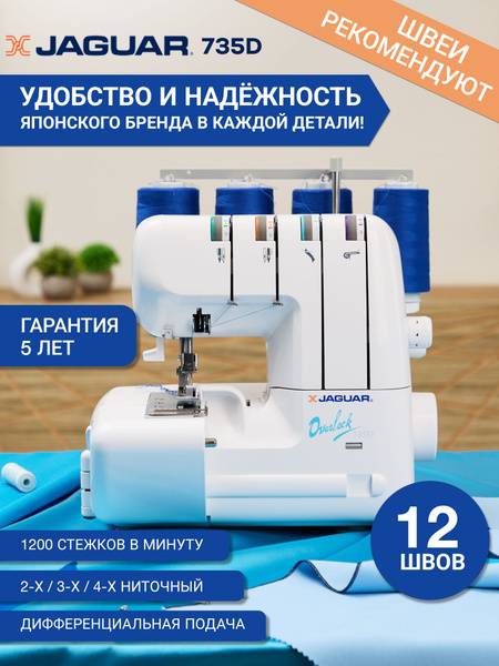 Jaguar 735D, overlock sewing machine, overlocker, serger, home overlocker, sewing machine, electric sewing machine, 4-thread overlock, 3-thread overlock, 2-thread overlock, flatlock stitch, sewing accessories, easy to use, compact sewing machine, sewing supplies, knit fabric, home textiles, clothing repair, crafting, beginner sewing machine, advanced sewing machine, adjustable stitch length, adjustable stitch width, automatic threader, foot pedal control, white sewing machine, sale, discount.