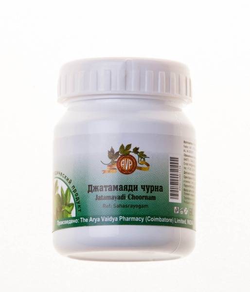 Jatamayadi Choornam, Jatamayadi powder, Ayurvedic powder, Ayurvedic medicine, India, herbal medicine, Vata, Pitta, antioxidant, analgesic, anti-inflammatory, wound healing, antifungal, antiseptic, acne treatment, menstrual problems, hypertension, stress relief, memory improvement, hormonal balance, reproductive health, Jatamansi, Costus, Frankincense, Valerian, Longleaf Pine, Alpinia, Sandalwood, 25g, herbal supplement.