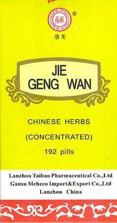 This remedy is indicated for both acute and chronic respiratory tract ailments, including pharyngitis, laryngitis, bronchitis, tracheitis, emphysema, pneumonia, chronic obstructive pulmonary disease (COPD), and bronchial asthma. Jie Geng Wan is particularly beneficial for symptoms such as: sore throat; cough with difficult expectoration; cough with yellow phlegm; hoarseness; voice loss; chest and diaphragmatic congestion; chest pain; swollen and reddened throat; dry, scratchy throat.