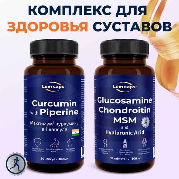 Experience superior joint health with our powerful dual-action formula. This natural supplement combines the potent anti-inflammatory benefits of Curcumin (150mg) enhanced with Piperine for optimal absorption, alongside a comprehensive blend of Glucosamine (700mg), Chondroitin (600mg), MSM (600mg), and Hyaluronic Acid (25mg). Specifically formulated for men and women, this Lemcaps® supplement promotes joint mobility, flexibility, and overall comfort. Supports cartilage health, reduces inflammation, and eases joint pain. For optimal results, take one capsule of the Curcumin blend and two tablets of the Glucosamine blend daily. Consult your doctor before use, especially during pregnancy or breastfeeding.
