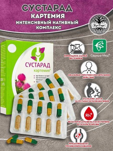 Sustarad Kartemiya by Sashera-Med is a specially formulated, balanced complex of natural ingredients in their native form. It provides significant restorative action on cartilage tissue, articular surfaces of bone epiphyses, synovial fluid, and periarticular tissues. Sustarad's natural components target the root cause of joint and articular element degradation, addressing symptoms and associated changes.