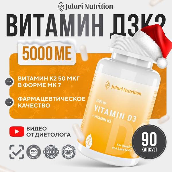 Support your bone and heart health with Julari Nutrition's Vitamin D3 & K2 supplement. Each capsule delivers a potent 5000 IU of Vitamin D3 and 50 mcg of Vitamin K2 for optimal absorption and maximum benefits. Ideal for adults of all ages and activity levels, including athletes seeking enhanced performance and recovery. This sugar-free, titanium dioxide-free, and maltodextrin-free formula provides essential nutrients for maintaining strong bones, teeth, and overall well-being. Manufactured by Zhiva Product PRO LLC.