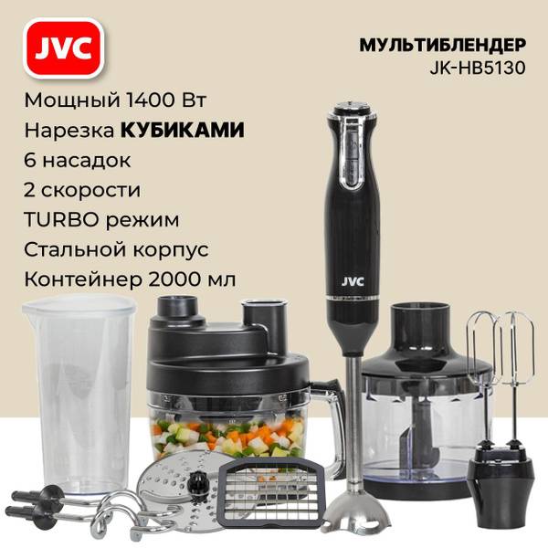 JVC JK-HB5130, blender, food processor, multi-functional blender, 1400W, high-power blender, dual beaters, dough hooks, cube cutter, slicing disc, chopper, 2L bowl, stainless steel, kitchen appliance, food preparation, easy cleaning, dietary needs, baby food, gift, powerful blender, variable speed, LED indicator, vegetable chopper, salad preparation, soup maker, sauce maker, dessert maker, time-saving kitchen appliance.