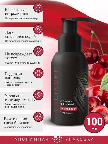 edible lubricant, water-based lubricant, cherry lubricant, sex lubricant, intimate lubricant, anal lubricant, vaginal lubricant, oral lubricant, couples lubricant, panthenol lubricant, lubricant with dispenser, 100ml lubricant, KALINOFF, sex toys, condoms, adult products, gift for couples, lubricant gift set, discreet shipping, premium lubricant, hypoallergenic lubricant, safe lubricant, long-lasting lubricant, arousal, sexual enhancement.