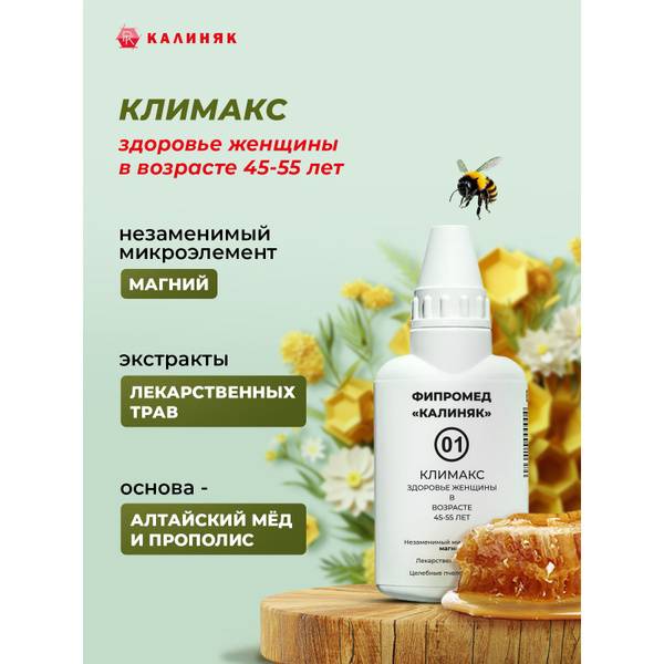 Experience relief from menopausal symptoms with Kaliyak Fipromed #01 "Climacteric," a delicious and effective dietary supplement formulated for women aged 45-55. This unique blend of medicinal herbs, bee products, and magnesium provides comprehensive support during perimenopause and menopause.