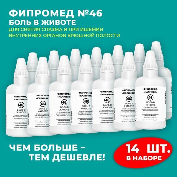 Kaliyak Fipromed #46 Abdominal Pain Relief is a phytopreparation specifically formulated to alleviate spasms and ischemia in the abdominal organs of elderly individuals. This unique blend combines molybdenum and vanadium micronutrients with potent herbs and bee products to promote overall health and well-being. It addresses abdominal pain stemming from spasms and ischemia by improving circulation and blood flow to the abdominal organs. The formula also offers broader benefits, enhancing the quality of life for seniors.