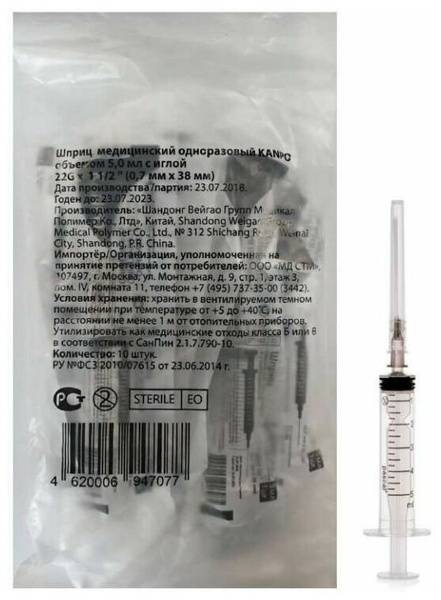 The KANPO 5ml disposable, three-part syringe with a 22G (0.7x38mm) needle is designed for subcutaneous, intramuscular, and intravenous administration of medications. Features include: a tri-bevel needle for minimal injection pain; a Luer-Lok tip for secure needle connection and prevention of slippage; a smooth-moving piston with a reliable seal to ensure accurate medication delivery; a clear, easy-to-read scale for precise dosage; a transparent polypropylene cylinder for optimal visibility of the contents; and a locking ring to prevent leakage. This pack contains 10 syringes.