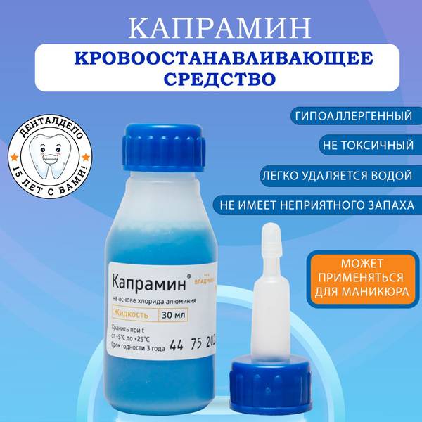 Description: Vladmiva Kapramin is a fast-acting hemostatic liquid designed for immediate control of bleeding. Simply saturate a cotton pellet or paper point with Kapramin and insert it into the bleeding canal or apply directly via pipette or root canal needle. Bleeding typically stops within one minute. Also ideal for retraction cord saturation during gingival retraction procedures in dentistry. 30ml bottle.