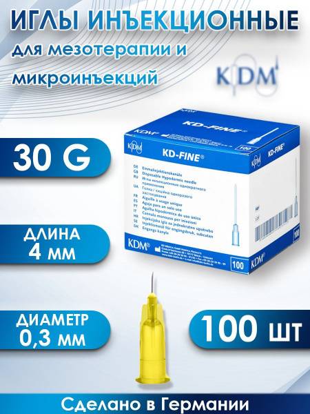Experience superior precision and comfort with KDM KD-FINE 30G mesotherapy needles. These high-quality, German-made needles feature a triple-bevel design for atraumatic injections, ensuring a virtually painless experience for your patients. Crafted from non-toxic, surgical-grade stainless steel, the needles maintain exceptional strength despite their thin walls. The 0.30x4mm size is ideal for mesotherapy procedures. Each needle boasts a Luer lock connection for secure attachment, individual blister packaging for sterility, and a convenient yellow color-coded identification. Order your box of 100 needles today and elevate the quality of your treatments. (30G Gauge).