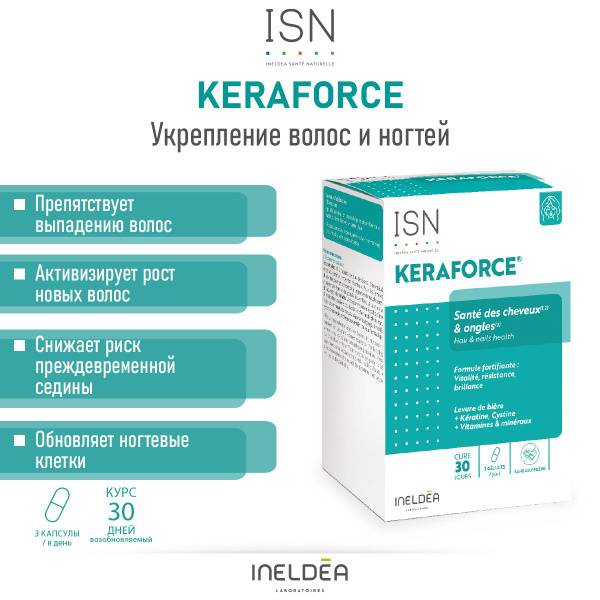 SEO Keywords: Keraforce, hair vitamins, nail vitamins, women's vitamins, hair growth vitamins, nail growth vitamins, hair loss prevention, stronger nails, healthier hair, French vitamins, Ineldea Sante Naturelle, biotin, bamboo extract, cystine, keratin, vitamin complex, 90 capsules.