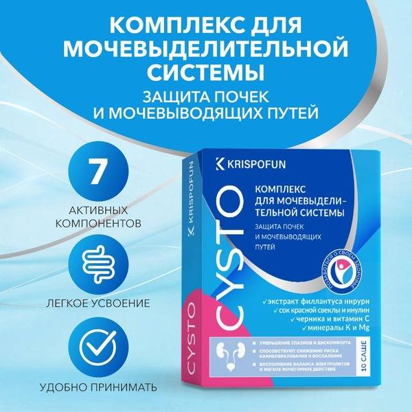 Millions suffer from non-infectious kidney and urinary tract diseases. Symptoms of chronic inflammation affect a significant portion of the adult population. Common causes include seasonal temperature changes, inadequate hydration, and excessive mineral salts in food and water. Krispofun Cysto offers a natural blend of uroprotective nutrients, including Phyllanthus niruri and bilberry extracts, inulin, minerals, beetroot juice, and L-ascorbic acid. This unique formulation helps combat symptoms of kidney and bladder dysfunction, inflammation, stone formation, and spasms.