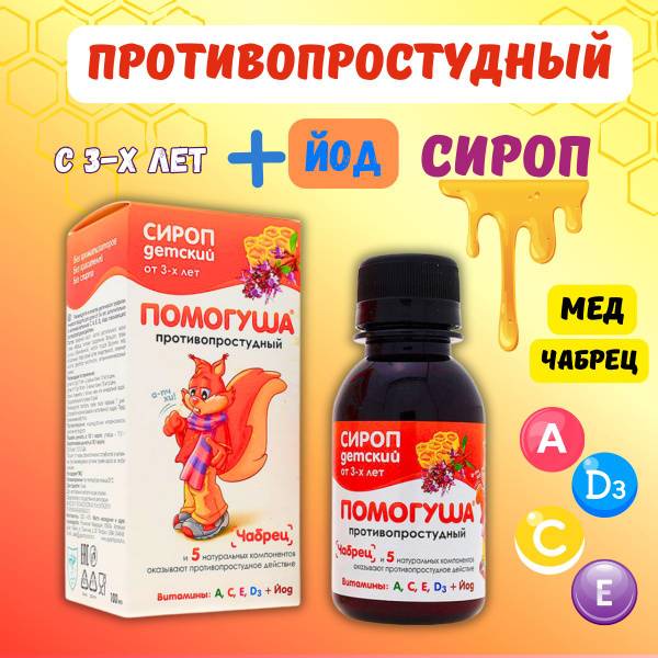 Pomogusha Children's Anti-Cold Syrup is a dietary supplement recommended for children aged 3 and above. It provides additional vitamins C, A, E, and D3, as well as iodine, to support the body's natural defenses against colds and flu. A delicious way to help boost your child's immunity.