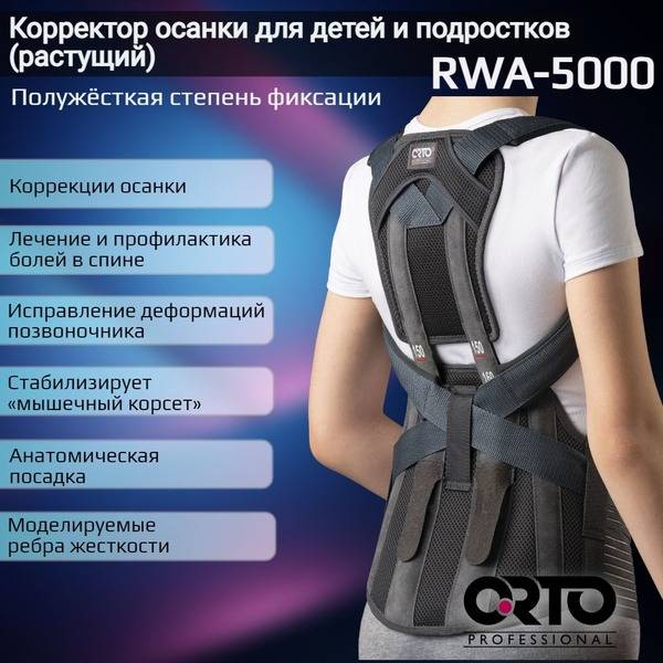 The ORTO Professional RWA 5000 is a spinal orthosis with an adjustable height ("growing") design, ideal for correcting posture and treating/preventing back pain in children and adolescents. It provides reclination support, stabilizes the "muscular corset," corrects spinal deformities, and improves quality of life. Designed to be used throughout a child's growth period.
