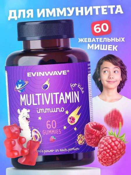 Keywords: Kids' vitamins, children's multivitamins, immunity gummies, vitamin D3 for kids, vitamin C for kids, zinc for kids, immune support, children's health, chewable vitamins, gummy vitamins, raspberry flavor, EVINWAVE IMMUNO, cold and flu season, healthy immune system, child's immune system, boost immunity, kids' multivitamins, toddler vitamins, children's immune system support.