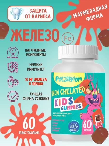 Keywords: iron gummies for kids, children's iron supplements, sugar-free iron gummies, iron deficiency in children, iron bisglycinate, kids vitamins, gummy vitamins, children's multivitamins, hemoglobin support, immune support, energy boost for kids, pediatric iron supplement, xylitol gummies, allergen-free gummies, sugar-free gummies, vitamins for kids age 3+, vitamins for kids age 7+, child health supplements, POLZABOOM