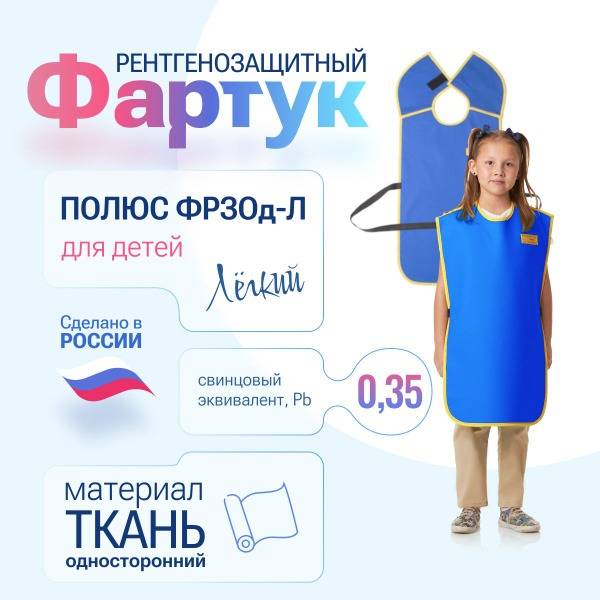 Lightweight and comfortable, the POLUS FRZOd-L single-sided lead apron offers superior X-ray protection for pediatric patients. This 0.35 mm Pb equivalent apron features a durable, blue fabric exterior and covers the child's body from the throat to the lower legs, including the shoulder area. Designed for children with heights between 120-134 cm (70 x 40 cm), it weighs approximately 2 kg and utilizes a secure hook-and-loop closure for easy and reliable fastening. Manufactured from radiopaque rubber with a comfortable fabric outer layer, this apron provides excellent front-side protection. For enhanced shielding, consider pairing with our children's lead collar (sold separately).