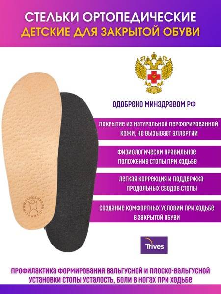 Description: Designed for closed-toe shoes, these children's leather orthotic insoles are developed in collaboration with the Albrecht Federal State Institution "St. Petersburg Scientific Center for Physical Culture and Rehabilitation" (FMBA of Russia). Made with specially treated, perforated natural leather, they are hypoallergenic and prevent irritation. They gently correct and support longitudinal foot arches, ensuring proper foot positioning during walking and providing comfortable wear in closed-toe shoes. Indicated for the prevention of valgus and flat-valgus foot deformities, and for relieving foot discomfort and pain during walking.