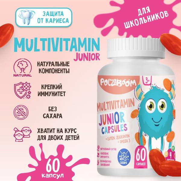 Keywords: children's vitamins, kids multivitamin, lutein for kids, omega-3 for kids, vitamin D3 for kids, vitamin A for kids, vitamin E for kids, vitamin K2 for kids, eye health supplements for children, brain development supplements, children's immune support, POLZABOOM, child health, healthy growth, cognitive development, allergen-free vitamins, sugar-free vitamins, natural children's vitamins.
