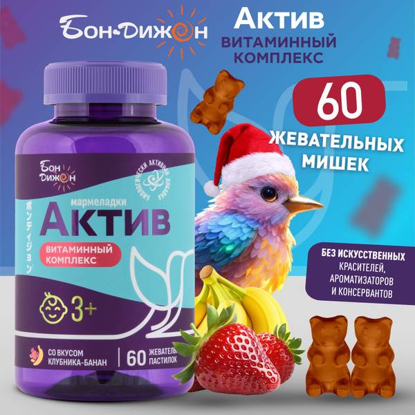 BonDijon Active Gummy Vitamins are a delicious and nutritious way to support your child's growth and development. These strawberry-banana flavored gummy multivitamins provide 11 essential vitamins: A, E, D3, C, B1, B2, B3, B6, B9, B12, and Biotin, all contributing to a healthy immune system, improved memory and concentration, and overall well-being. Each gummy is a tasty treat packed with vital nutrients, easily absorbed by young bodies. A 60-count bottle provides a full month's supply, making it easy to maintain a daily vitamin routine. Choose BonDijon Active Gummy Vitamins – a trusted choice for your child's health and happiness.