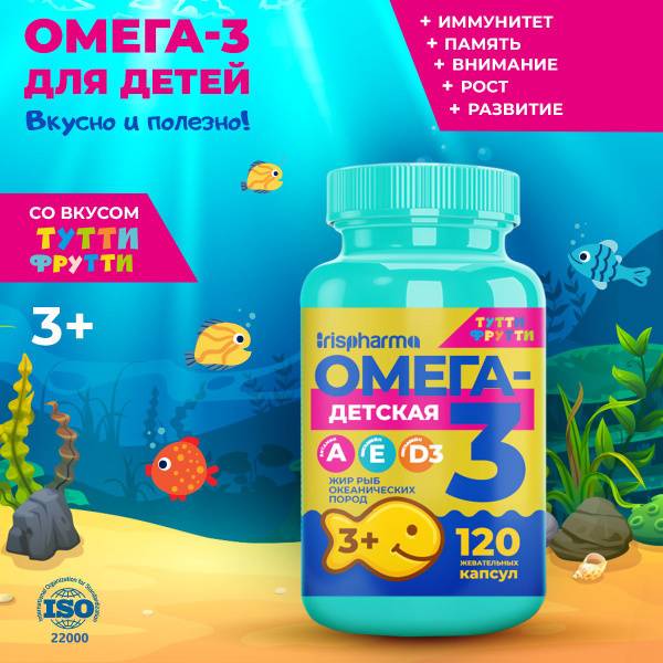 Keywords: Omega-3 for kids, Omega-3 gummies, children's vitamins, kids vitamins, vitamin D3 for kids, vitamin A for kids, vitamin E for kids, immunity booster for kids, brain health for kids, cognitive function, focus, concentration, memory, chewing gummies, tutti-frutti, Irispharma, fish oil gummies, children's omega-3, kid's health supplements, healthy kids, 3+ years, chewable vitamins, natural flavors, natural colors, immune support, brain development