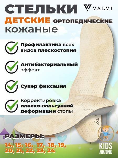 Leather, anatomical, and supportive orthotic insoles designed for children (sizes 33/34) to prevent and correct flat feet and valgus deformities. These insoles provide physiological support, maintaining proper foot alignment. High inner and outer borders, along with a cup-shaped heel, prevent foot rolling inward or outward. The rigid support structure keeps the foot correctly positioned, reducing stress on joints during movement. Perfect for active children needing preventative or corrective foot care. VALVI brand.