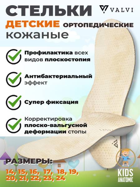 Leather, structured, anatomical insoles for children, designed to prevent and correct flat feet and valgus deformity. These insoles provide physiologically correct foot positioning. High inner and outer borders, along with a cup-shaped heel, prevent the foot from rolling inward or outward during movement. The supportive structure holds the foot in the correct position, reducing strain on joints during walking. Ideal for children's shoes, sizes 31/32. VALVI brand.
