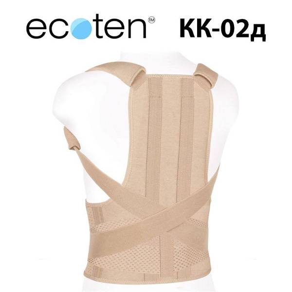 The Ecoten KK-02D reinforced orthopedic corset (reclinator) for children (size 1) provides effective support and correction for various spinal conditions. This high-quality support features two adjustable, removable metal stays and two shorter plastic side stays for customized support. The double-strapping system and non-stretchable, adjustable length straps ensure a secure and comfortable fit. Soft padding on the straps enhances comfort, while breathable, moisture-wicking, high-cotton content materials promote healthy skin. Beige in color.