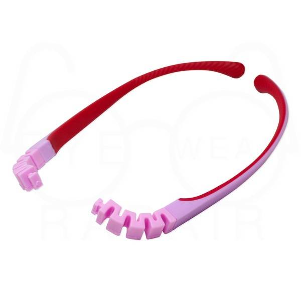 Durable and lightweight children's eyeglass temple arms made from hypoallergenic silicone and impact-resistant TR90. These replacement arms feature a vibrant red and lilac two-tone design, providing a comfortable and secure fit for your child's glasses.