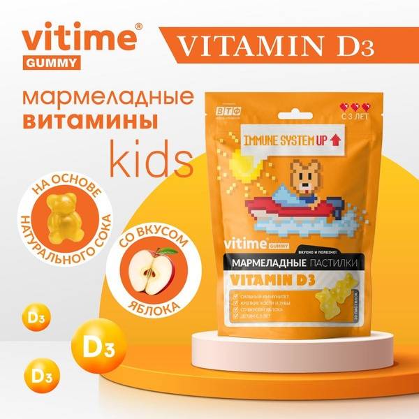 Support your child's healthy growth and development with VITime Vitamin D3 Gummies. Each delicious apple-flavored gummy provides 400 IU (100% of the recommended daily allowance) of Vitamin D3 in its highly bioavailable cholecalciferol form. Vitamin D3 is crucial for: