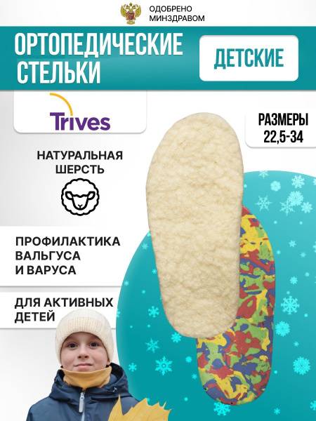 Trives ST-168 children's winter orthotic insoles (size 32) provide warmth and support for growing feet. Developed in collaboration with the Albrecht Federal State Scientific Center for Physical Culture and Rehabilitation (FMBA of Russia), these insoles feature a plastic arch support for gentle correction of flat feet and valgus deformity, a shock-absorbing EVA layer, and a soft, high-quality sheepskin lining. They alleviate foot fatigue and pain, promoting proper foot posture and reducing impact during walking. Suitable for the prevention and treatment of flat feet and valgus. Care instructions: dry clean only; avoid heat, moisture, and direct sunlight.