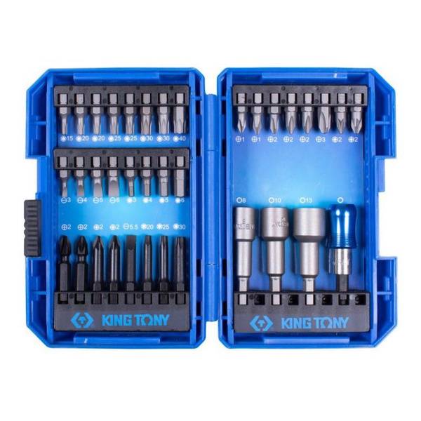 The King Tony 1036MR 36-piece 1/4" drive bit set is your comprehensive solution for common fastening tasks. This versatile set includes a wide range of magnetic bits (50mm & 25mm lengths) covering Phillips (PH1, PH2, PH3), Pozidriv (PZ2), Torx (T10-T40), Hex (3-6mm), and slotted (SL3.0-6.0mm) drive types. Also included is a 63mm magnetic bit holder with secure locking mechanism and metric 6-point sockets (8mm, 10mm, 13mm). Ideal for professionals and DIY enthusiasts alike, this high-quality set ensures reliable performance and long-lasting durability.
