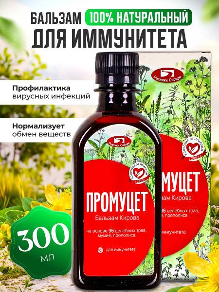 Rodniki Sibiri's Promuget (Kirov Balm) is a premium 300ml biologically active supplement designed to support overall health and well-being. This invigorating, fortifying balm promotes improved physical fitness and increased vitality. Formulated with natural ingredients renowned for their beneficial properties, Promuget helps restore energy after physical exertion or a demanding workday. It supports the immune system, offering crucial protection during cold and flu season.