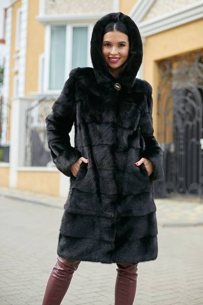 Indulge in the opulence of this exquisite black mink coat, handcrafted by the renowned Kirov Fur Factory. This 100cm long masterpiece boasts a captivating cross-cut design, setting it apart from traditional styles. Unlike vertically-sewn coats, the horizontal arrangement of the fur plates creates a unique visual texture that accentuates the rich, lustrous beauty of the mink. This innovative technique is applied throughout the coat, including the sleeves and hood, ensuring consistent quality and exceptional craftsmanship.