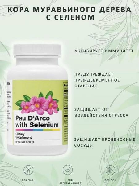 Pau d'Arco with Selenium capsules offer a powerful combination to support your immune system and overall well-being. This supplement features Pau d'Arco bark powder, traditionally used by Latin American indigenous peoples for its anti-inflammatory and antiviral properties. Rich in lapachol and xyloidine, it helps combat bacterial and fungal infections. Selenium (as L-selenomethionine), a potent antioxidant, protects against stress, promotes healthy aging, and strengthens immune cell activity. Vitamin C enhances selenium absorption, strengthens blood vessels, and supports the body's natural defense mechanisms, reducing the severity and duration of colds. Take 1-2 capsules daily with food.